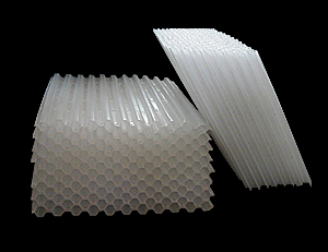 六角形蜂窩填料(斜管填料)材質有聚丙烯(pp)聚氯乙烯(pvc)乙丙共聚三種。組裝形式的斜管和直管兩種形式。